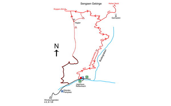 Ausgangspunkt unserer Tour ist der Parkplatz unweit des Jagdhauses Rettenbach (610 m, Abb. 2) am Ende einer ca. 5 km langen, schmalen Straße, die von der Bundesstraße B 138 im westlichen Gemeindegebiet von Windischgarsten abbiegt. Schon bei der Fahrt zum Ausgangspunkt kann man einen sehr schönen Blick auf den Hagler, das Hohe Nock und den Gamsplan (Abb. 3) genießen. Kurz vor dem Parkplatz zweigt links der Weg Nr. 463 Richtung Norden ab. Gleich schnell an Höhe gewinnend, geht es im Waldgebiet vorbei an ersten Felsbrocken aufwärts. Nach einer Serpentine – es werden noch unzählige folgen – folgt eine längere, teilweise fast ebene Hangquerung, die uns zum Budergraben (ca. 800 m) führt, der tief unter uns liegt. Nun im steilen, offenen Gelände geht es mit Blick zum Gamsplan (1.902 m, Abb. 4) und den darunter liegenden, noch von uns zu bewältigenden Hängen mit Hilfe von Serpentinen aufwärts. Nach etwa 45–60 Minuten gelangt man zu einer etwas engeren Stelle, bei der schwindelfreie Wanderer einen Blick in den tief unter uns liegenden Budergraben (Abb. 5) wagen können. Nun führt uns der Steig etwa 10–15 Minuten auf der linken Seite parallel zum Graben zum sehr steilen, felsigen Talschluss. Vorsichtig muss man auf einem schmalen Steig voller Schottersteine ein kurzes Steinkar (ca. 1.000 m, Abb. 6) überschreiten, dann warten bereits die nächsten Serpentinen auf uns.