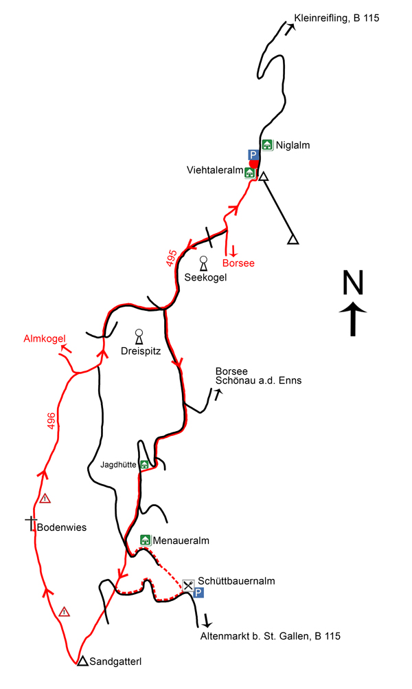 Am schnellsten gelangt man von der östlich der Bodenwies gelegenen, bewirtschafteten Schüttbauernalm (1.070 m), zu der man auch mit dem PKW auffahren kann, zum Gipfel. Unsere Rundtour von Norden aus ist zwar erheblich länger, bietet aber unterwegs immer wieder schöne Aussichtsstellen. Der Ausgangspunkt liegt am Ende der etwa 7,3 km langen, asphaltierten Bergstraße, die von der Bundesstraße B 115 Richtung Kleinreifling abzweigt und nach der Ortsdurchfahrt durch den Hammergraben zum leider geschlossenen Berggasthof Niglalm (823 m) führt. Da es hier früher auch ein Skigebiet gab, stehen auf dem Parkplatz zwischen der Niglalm und der ebenfalls geschlossenen Viehtaleralm genügend Autoabstellplätze zur Verfügung. Vorbei an den nicht mehr benutzten Liftanlagen (Abb. 2) geht es zu Beginn der langen Tour am rechten Rand einer Wiese auf dem Weg Nr. 495 gleich etwas steiler bergan. Am oberen Ende der Wiese angekommen, geht es kurz auf breitem Weg links zu einer Wegkreuzung (ca. 935 m), die man nach etwa 20 Minuten von der Niglalm erreicht. Wir halten uns rechts und wandern nun auf einer Forststraße in einem langgezogenen Linksbogen fast eben am Seekogel (1.062 m, Abb. 3) vorbei.