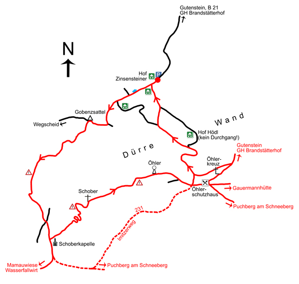 Nordöstlich vom Schneeberg liegen im südwestlichen Teil der Dürren Wand mit Schober und Öhler (Abb. 1) zwei durch einen langgezogenen, felsigen Kamm verbundene Gipfel. Die Überschreitung dieser beiden fast gleich hohen niederösterreichischen Voralpenberge, die an manchen Stellen schon ein wenig alpinen Charakter aufweist, zählt zu den Klassikern unter den Wanderfreunden aus dem Osten Österreichs und auch aus dem benachbarten Ausland. Wer lieber beim Anstieg als beim Abstieg steinige und felsige Stellen überwindet, dem empfehlen wir die Überschreitung von West (Schoberkapelle) nach Ost (Öhlerschutzhaus). Weiters ist zu beachten, dass sich der Routenverlauf des nachfolgenden Wandertipps sowohl beim Auf- als auch beim Abstieg in den letzten Jahren verändert hat, was aber in manchen Plänen und Beschreibungen noch nicht berücksichtigt worden ist.