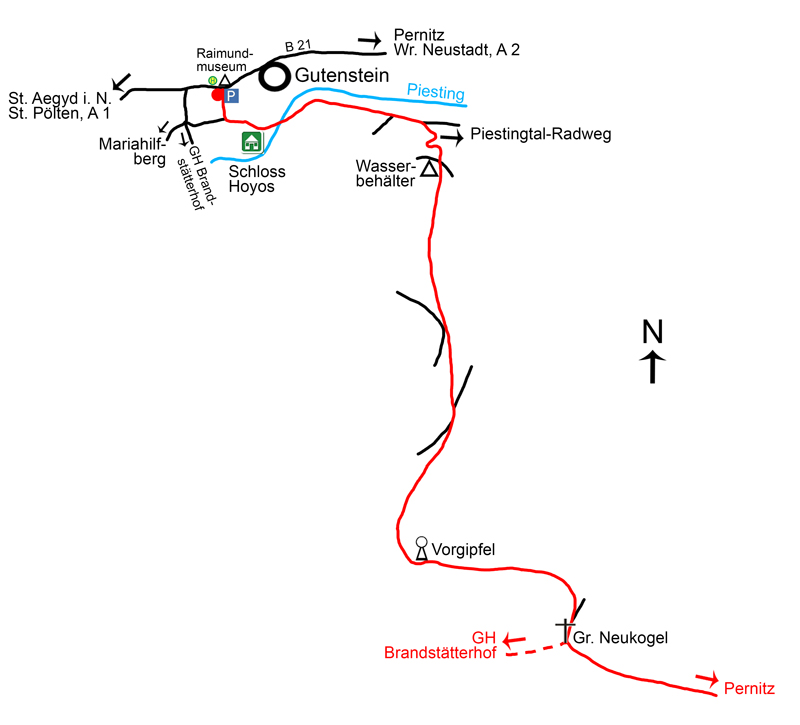 Schon im Biedermeier war der kleine Ort Gutenstein im Piestingtal für betuchte Wiener Bürger Treffpunkt für ihre Sommerfrische. Der sicherlich berühmteste war der Schauspieler und Dichter Ferdinand Raimund, der die kleine Gemeinde in den Wiener Voralpen liebte und viel Zeit hier verbrachte. Bekannte Theaterstücke wie „Der Barometermacher auf der Zauberinsel", „Der Bauer als Millionär" und „Der Verschwender" sind bis heute Fixpunkte auf den Programmen vor allem österreichischer Bühnen. Nach seinem Tod im Jahre 1836 wurde der berühmte Dichter auf seinen Wunsch hin in Gutenstein begraben. Die jährlich stattfindenden Raimundspiele sind seit 1993 Anziehungspunkt für Theaterfreunde von nah und fern. Aber auch zum Wandern lohnt sich ein Ausflug ins westliche Piestingtal. Der nachfolgende Wandertipp führt südlich der Raimundgemeinde auf den Großen Neukogel (Abb. 1). Aber gleich vorweg: Für Freunde schöner Rundblicke ist die hauptsächlich durch Waldgelände verlaufende Tour nicht geeignet, unterwegs gibt es nur wenige Aussichtspunkte.
