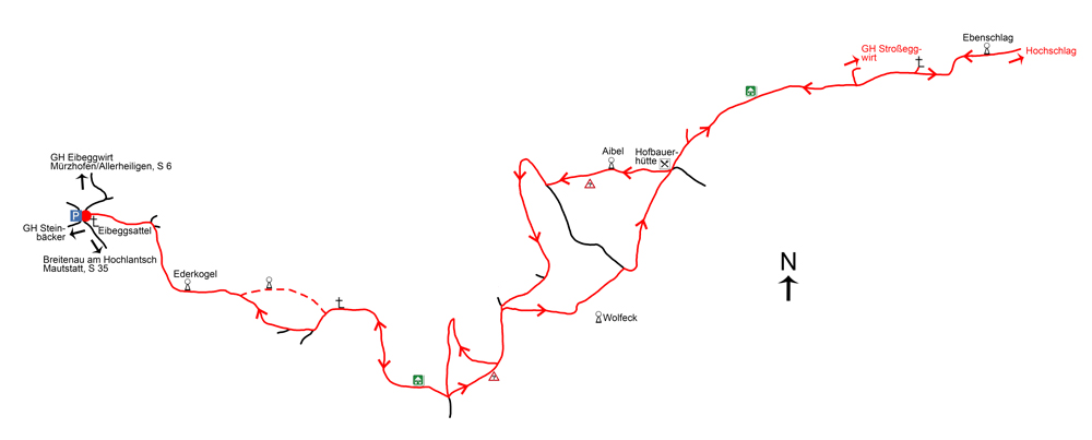 Der Ausgangspunkt unserer Tour ist der Eibeggsattel (1.001 m), wo ein kleiner Parkplatz zur Verfügung steht. Links neben einem großen Marterl (Abb. 2) wandern wir zu Beginn Richtung Osten auf einem breiten Weg zu einer Lichtung, bei der das Wiesengelände des Aibels (Abb. 3) bereits gut zu sehen ist. Wieder im Wald. geht es fast eben zu einem Forstweg, den wir aber nur am Rand „streifen“, da unser Waldsteig sofort rechts – nun Richtung Südosten –immer steiler werdend über viele Baumwurzeln zu unserem ersten Gipfel, dem Ederkogel (ca. 1.122 m), aufsteigt, den wir bereits nach 10–15 Minuten vom Ausgangspunkt erreichen. Eigentlich handelt es sich nur um einen im Wald gelegenen Zwischengipfel. Hier hat man erstmals das Problem mit der Beschilderung: Die Holztafel steht etwa 10 Meter von der höchsten Stelle entfernt und die Höhenangabe auf dieser (1.098 m) ist garantiert falsch. Wir wandern auf dem schwach ausgeprägten Waldkamm wieder Richtung Osten eben weiter, bevor der im Sommer meist stark verwachsene, von Sträuchern flankierte Steig beginnt, nicht allzu steil abwärts zu führen. Eine weitere Erhebung wird anschließend auf breitem Waldweg rechts umgangen. Unser Weg trifft zweimal hintereinander zuerst auf einen von rechts kommenden Pfad bzw. etwas später auf eine Forststraße, in die wir jeweils links einbiegen. In den letzten Gehminuten öffnet sich erstmals der schöne Blick Richtung Süden zu den Felswänden des mächtigen Hochlantschs (1.720 m, Abb. 4), die wir heute noch öfter sehen werden. Wenige Meter auf einer Forststraße führen uns ins offene Gelände zu einem Sattel mit einem alten Wegkreuz (1.078 m), der auf manchen Plänen die Bezeichnung Ederkogel trägt: Von diesem sind wir aber bereits rund 15 Minuten entfernt. Links von uns erblickt man Richtung Norden die Hohe Veitsch (1.981 m, Abb. 5).