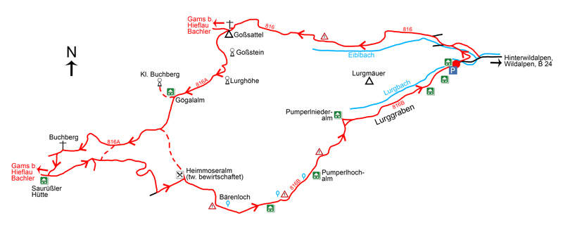 Im Nordwesten der Hochschwab-Region im Grenzbereich zu den Eisenerzer, den Ybbstaler und den Ennstaler Alpen mit dem Gesäuse befindet sich eine der landschaftlich faszinierendsten Regionen der Obersteiermark. Schluchtartige, von felsdurchsetzten Steilhängen flankierte, enge Täler sorgen dafür, dass es hier kaum Besiedlung gibt. Schon auf dem Weg zu unserem Ausgangspunkt – durch das canyonartige Salzatal, ein Rafting-Eldorado, nach Wildalpen und von dort weiter nach Hinterwildalpen – kann man sich von der Einzigartigkeit der Berglandschaft überzeugen. Vor allem für Bergwanderer, die gerne auf steilen, steinigen Pfaden unterwegs sind, ist diese Region ein wahres Paradies! Auch bei unserem nachfolgenden Wandertipp, der mit einer etwas aufwändigeren Tour rund um die Lurgmäuer und auf den 1.563 m hohen Buchberg führt, geht es sowohl beim Aufstieg als auch beim Abstieg über teilweise recht anspruchsvolle Wege.