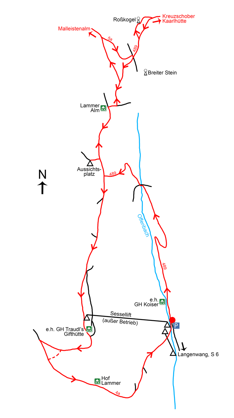 Gleich beim Ausgangspunkt unserer Tour, dem Parkplatz gegenüber der Talstation des nicht mehr in Betrieb befindlichen Sesselliftes (939 m, Abb. 2), spürt man ein wenig von der Trostlosigkeit des geschlossenen Skigebietes. Obwohl schon in die Jahre gekommen und etwas marode, möchte man glauben, der Betrieb könnte morgen wieder starten, da alle Anlagen noch vollständig vorhanden sind. Wir wandern auf der asphaltierten Bergstraße, auf der wir von Langenwang hierher gekommen sind, weiter Richtung Norden aufwärts. Dabei geht es gleich zu Beginn am ehemaligen Almgasthaus Koiser vorbei, das unmittelbar neben einer Skipiste (Abb. 3) steht. Kurz im offenen Gelände, geht es dann im Wald stetig bergan, nach zwei kurz hintereinander liegenden Serpentinen geht die asphaltierte Straße in eine sandige Forststraße über, die weiter rechts oberhalb eines Baches im Offenbachgraben taleinwärts führt. Nach etwa 25–30 Minuten verlassen wir bei einer Gabelung die Forststraße und steigen nun etwas steiler auf einem markierten Waldsteig aufwärts, der sich 5-10 Minuten später von Richtung Norden nach Richtung Südwesten wendet und uns in weiteren 5–10 Minuten zu einem Forstweg bringt, in den wir rechts einbiegen. Mit wenigen Schritten wieder Richtung Norden gelangen wir zu einer größeren Kreuzung, bei der wir uns geradeaus halten. Zuvor aber sollte man sich auf der links führenden Forststraße knapp 50 Meter zu einer größeren Lichtung begeben, um von dort einen wirklich schönen Blick Richtung Südwesten ins Mürztal (Abb. 4) zu genießen, das speziell im Herbst oft bis in den späten Vormittag hinein mit Nebel gefüllt ist. Wieder zurück bei der großen Kreuzung geht es jetzt abermals auf einer breiten Forststraße bergan. Bei einer Lichtung ist rechts Richtung Südosten das Stuhleck (1.782 m, Abb. 5) gut zu sehen. Nach ungefähr 60–70 Minuten erreicht man dann rechts neben einem stattlichen Jagdhaus die Lammeralm (1.309 m).