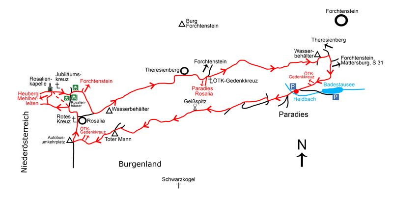 Vom Autoabstellplatz bei der Lichtung („Paradies“) westlich des Forchtensteiner Badestausees über den Geißspitz zur Rosalienkapelle mit zahlreichen kleineren Gegensteigungen beim Auf- und Abstieg fast 500 Hm in etwa 1¾–2,0 Stunden (Aufstieg) bzw. über den Ortsteil Theresienberg in ca. 1½–1¾ Stunden (Abstieg).