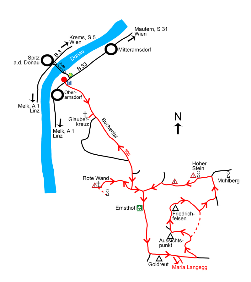 Knapp oberhalb der Anlegestelle der Autofähre, mit der man von Spitz (Abb. 2) vom Nord- (West-) zum Süd-(Ost-)-Ufer übersetzen kann, zweigt eine markierte, asphaltierte Straße von der Bundesstraße B 33 Richtung Südosten ab. Gleich bei der Abzweigung (ca. 215 m) stehen einige wenige Autoabstellplätze zur Verfügung. Unweit davon gibt es darüber hinaus eine Bushaltestelle. Nur mäßig ansteigend geht es auf der asphaltierten Straße in rund 5 Minuten neben Weinstöcken und mit schönem Blick Richtung Norden (Abb. 3) zu einer Wegkreuzung (252 m). Beim Aufstieg bleiben wir geradeaus noch kurz auf der schmalen Straße, bis wir zu einer Weggabelung kommen. Wer es lieber bequem hat, könnte – sich rechts haltend – auf der hier beginnenden Forststraße das erste Stück aufsteigen. Wir aber wandern weiter geradeaus Richtung Südosten in das waldige Buchental (Abb. 4). Auf breitem Weg geht es nun rechts von einem Bach ziemlich steil aufwärts. Langsam lichtet sich der Graben und unser Weg geht für einige Zeit in einen Steig über. Nochmals im Waldgelände steil biegen wir nach etwa 25–30 Minuten vom Ausgangspunkt wieder in die Forststraße ein, die wir ebenso verwenden hätten können. Wir verlassen nach etwa 5–10 Minuten die nur gering ansteigende Forststraße rechts und steigen recht steil auf einem oft etwas rutschigen Weg auf, bis wir nach ca. 50–55 Minuten vom Ausgangspunkt eine querende Forststraße (ca. 530 m) erreichen. Wer gleich in etwa 20 Minuten zum Aussichtspunkt oberhalb der Roten Wand gehen möchte, biegt hier rechts ab.