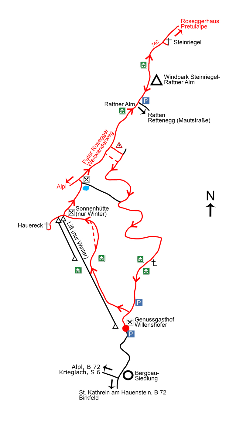 Der Ausgangspunkt der Wanderung liegt östlich des Kamms beim Genussgasthof Willenshofer (996 m, Abb. 2), der gegenüber der Talstation eines nur im Winter betriebenen Sesselliftes und oberhalb der Gemeinde St. Kathrein am Hauenstein liegt. Von hier hat man einen ersten Blick die steilen Wiesenhänge (Abb. 3) aufwärts, die wir am Beginn der Wanderung erklimmen werden. Wenige Meter nach dem Gasthaus geht die asphaltierte Zufahrtsstraße in eine Sandstraße über. Genau an dieser Stelle biegt links bergwärts Richtung Nordwesten ein Wiesenweg (Weg Nr. 12) ab, der uns steil zur Lifttrasse führt. Weiterhin steil geht es jetzt auf dieser aufwärts. Links von uns ist von einer Rastbank Richtung Süden der bis zu seinem Gipfel bewaldete Teufelstein (1.498 m, Abb. 4) und Richtung Südosten St. Der Ort Kathrein am Hauenstein (Abb. 5) zu sehen. Nach Durchschreiten eines Viehgatters geht es rechts neben der Lifttrasse nicht mehr so steil auf einer Skipiste (Abb. 6) – links vorbei an einer kleinen Holzhütte und rechts vorbei an einer Bergrettungshütte – weiter bis zum nächsten Viehgatter. Dort befindet sich zusätzlich zum Sessellift die Talstation eines Skiliftes. Wir halten uns rechts und marschieren am rechten Rand der Skipiste oder auf dem markierten, rechts parallel verlaufenden Waldsteig wieder zu einem Viehgatter. Im oberen Bereich der Skipiste halten wir uns links und wandern direkt zur bereits sichtbaren Sonnenhütte (Abb. 7), die aber nur im Winter bewirtschaftet wird, und zur Bergstation des Sesselliftes. Links hinter dieser steht etwas versteckt das Gipfelkreuz des Hauerecks (Abb. 8), das wir vom Ausgangspunkt nach etwa 45–50 Minuten erreichen.