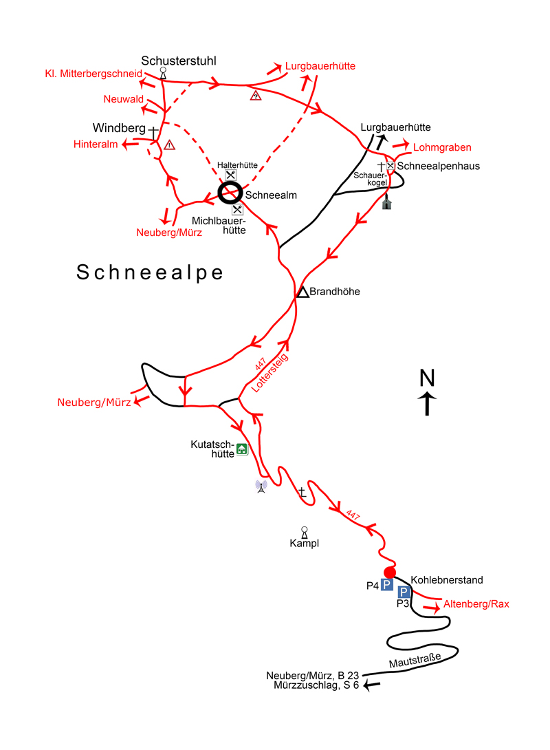 Fast senkrecht und felsig ragen die Wände der Schneealpe (Abb. 1) in die Höhe, die dann oben in eine recht flache, großflächige und mit Gras bedeckte Hochfläche mit einigen – größtenteils – sanften Erhebungen (Abb. 2) übergehen. Von den zwei höchsten, dem 1.903 m hohen Windberg und dem benachbarten Schusterstuhl (1.875 m), die wir beim nachfolgenden Wandertipp besuchen werden, hat man eine großartige Rundumsicht auf die facettenreiche und imposante Bergwelt der steirisch-niederösterreichischen Kalkalpen. Als dritten Gipfel werden wir bei unserer Tour den Schauerkogel (1.788 m) am südöstlichen Rand der riesigen Schneealm besuchen, auf dem sich das Schneealpenhaus befindet. Die meisten Wege auf die Schneealpe sind lang, steil, oft felsig sowie mit Sicherungen ausgestattet und erfordern daher häufig Trittsicherheit und Schwindelfreiheit. Das ist beim nachfolgenden Wandertipp nicht so. Zum Ausgangspunkt bei den beiden oberen Parkplätzen (P3 und P4) Kohlebnerstand (ca. 1.450 m) führt von Neuberg im Mürztal eine größtenteils nicht asphaltierte und nicht ganz billige Mautstraße. Von dort geht es auf der für den Verkehr gesperrten, breiten Sandstraße auf die Hochfläche der Schneealpe. Wer es etwas interessanter haben will, kann im oberen Bereich statt der Straße den etwas steileren und steinigen Lottersteig verwenden, was wir beim Aufstieg auch tun werden.