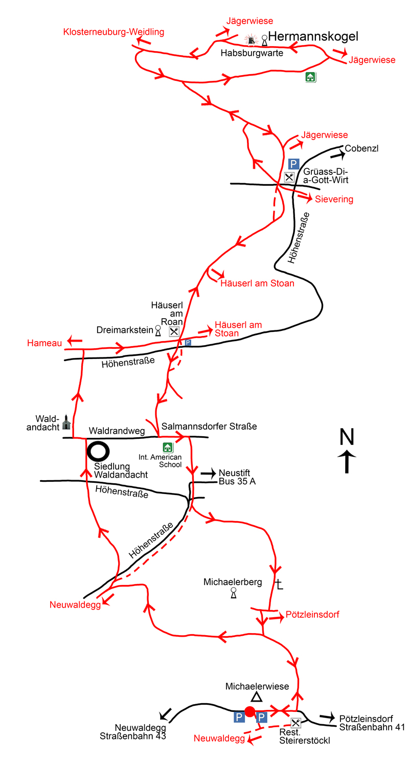 Die Bewohner der österreichischen Bundeshauptstadt Wien müssen für eine schöne Tour nicht weit fahren. Sogar innerhalb der Stadtgrenzen kann man im Wienerwald einiges an Höhenmetern erwandern. So zum Beispiel, wenn man im Nordwesten von Wien den höchsten Berg der Stadt, den Hermannskogel (542 m, Abb. 1), besteigt. Bei unserem nachfolgenden Wandertipp, der vom Parkplatz bei der Michaelerwiese (ca. 325 m) über den Michaelerberg (387 m) und den Dreimarkstein (454 m) mit zahlreichen Gegensteigungen beim Hin- und Retourweg zur Habsburgwarte auf dem Hermannskogel führt, muss man nicht nur über 550 Hm bewältigen, man genießt auch immer wieder schöne Ausblicke auf die Stadt und kann sich in mehreren Gasthäusern unterwegs stärken.