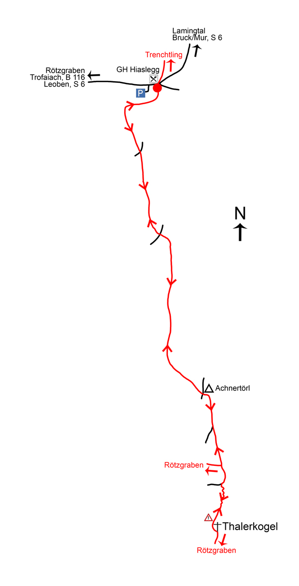 Das Gipfelziel des nachfolgenden Wandertipps, der 1.656 m hohe Thalerkogel (Abb. 1), liegt nicht mehr in der Kernzone, sondern im südlichen Umfeld der Hochschwab-Region, zwischen dem Lamingtal im Osten und dem Rötzgraben im Westen. Von der höchsten Stelle, die bereits wenige Meter oberhalb der Baumgrenze liegt, hat man nicht nur einen grandiosen Blick zum Hochschwab (2.277 m) und zu zahlreichen weiteren Gipfeln der Region, sondern auch zu großen Teilen der übrigen steirischen Bergwelt. Der Weg vom Ausgangspunkt, dem Almwirtshaus zum Hiaslegg (1.154 m), das sich auf dem höchsten Punkt des Straßenübergangs zwischen den beiden genannten Tälern befindet, zum Gipfel des Thalerkogels weist eine interessante Komponente auf: Der erste Teil zum Achnertörl (1.402 m), auf dem man fast genau die Hälfte der zu bewältigenden Hm, aber etwa ¾ der Wegstrecke absolviert, ist nach einem Anstieg zu Beginn teilweise fast eben bzw. kaum ansteigend. Der zweite Teil vom Achnertörl zum Gipfel ist dann dafür umso steiler, aber stets gut begehbar. Für den abschließenden Steilaufstieg wird man dann mit einem 360°-Panoramablick belohnt! Noch eine kurze Vorbemerkung: Der Weg ist zwar nicht markiert, aber teilweise beschildert und stets leicht zu finden.