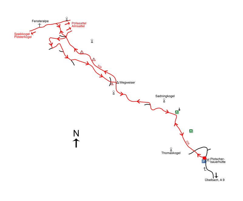 Ausgangspunkt des nachfolgenden Wandertipps ist die Plotscherbauerhütte (1.133 m, Abb. 2), von deren Terrasse man Richtung Osten (Abb. 3) den Schöckl (1.445 m) erblickt. Bereits während der Fahrt zu dieser bewirtschafteten Almhütte kann man sich von der Schönheit der Landschaft im Grazer Umland (Abb. 4) überzeugen. Gleich oberhalb der Hütte befindet sich ein Parkplatz, von dem wir unsere Tour Richtung Nordwesten starten. Zu Beginn steil auf einem durchwegs gut markierten, breiten, steinigen Weg wandern wir mit Querung einer Forststraße an den bewaldeten Osthängen des Thomaskogels (1.301 m) aufwärts. Bei der nächsten Forststraßen-Querung öffnet sich das Gelände und wir marschieren entlang eines Stacheldrahtzauns über eine große Almwiese (Abb. 5) dem Sadningkogel entgegen. Unser Wiesenpfad wendet sich ein wenig nach rechts und wir erreichen nach ungefähr 20 Minuten eine Almhütte (ca. 1.285 m, Abb. 6) mit einer darüber liegenden Kapelle und einem Wiesensattel, zu denen wir aber nicht aufsteigen. Wir halten uns links und übersteigen bereits zum dritten Mal einen Zaun. Nur mäßig ansteigend geht es nun längere Zeit an den bewaldeten Südhängen des Sadningkogels (1.449 m) auf einer Forststraße nicht allzu steil aufwärts. Nur einmal – bei einer Lichtung – erhaschen wir einen schönen Blick auf den westlichen Teil der Grazer Hausberge (Abb. 7) südwestlich von uns. Mit einer Rechtskurve wechseln wir auf die Westseite des Sadningkogels. Bald danach verlassen wir rechts die Forststraße und kommen zu einem Sattel, bei dem nördlich von uns der Hochschwab (2.277 m, Abb. 8) erstmals sichtbar wird. Zuerst auf einem breiten Waldsteig und dann im offenen Gelände auf einem Weg geht es etwas steiler bergauf zu einer unbenannten Erhebung links von uns und dann – erneut auf einem breiten Waldsteig – abwärts zum nächsten Sattel.