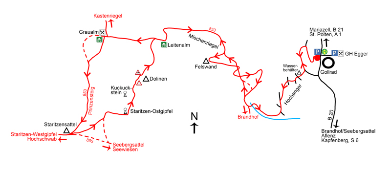 Am besten steigt man auf dem Aufstiegsweg über den Staritzensattel und den Prinzensteig (Abb. 22) wieder zur Graualm ab und wandert dann leicht aufsteigend zur Leitenalm. Dafür benötigt man ca. 1,0–1¼ Stunden. Um etwa 15–20 Minuten schneller ist man, wenn man auf teilweise schwer erkennbaren Trittspuren Richtung Norden rechts vorbei am unmittelbar benachbarten und etwa gleich hohen Kuckuckstein (Abb. 23) über steiles Latschen- und Wiesengelände (Abb. 24) direkt in ca. 45–50 Minuten zur Leitenalm absteigt. Dafür benötigt man neben dem unbedingt erforderlichen Orientierungssinn auf jeden Fall auch Trittsicherheit, besonders am häufig schmalen Rand von oft mehreren metertiefen, spektakulären Dolinen (Abb. 25). Etwas westlich von der Leitenalm stößt man dann auf die Forststraße, in die man rechts einbiegt. Wieder etwas aufwärts geht es vorbei an den Almhütten (Abb. 26) und dann mit großartigen Panoramablicken zur Hohen Veitsch, zur Tonion (Abb. 27) und nach Mariazell von der Nord- auf die steile, waldige Ostseite der Aflenzer Staritzen im Bereich des Mischenriegels. Beim Abstieg nützen wir nicht die markierten Abkürzungen, sondern bleiben auf der Forststraße. Dabei geht es in einer Serpentine vorbei an einer imposanten Felswand (Abb. 28). Etwa 35–40 Minuten nach der Leitenalm zweigen wir dann bei dem Gatter, das speziell bei Lawinengefahr im Winter gesperrt ist, links auf den Steig nach Gollrad ab und wandern in etwa 30–35 Minuten über den Kohlanger auf dem Aufstiegsweg abwärts nach Gollrad (Abb. 29). Für den gesamten Abstieg durch das Latschengebiet nördlich des Staritzen Ostgipfels benötigt man etwa 1¾–2,0 Stunden. Wer lieber über den einfacheren Aufstiegsweg absteigt, sollte dafür ungefähr 15–20 Minuten mehr an Zeit einplanen.