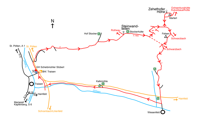Ausgangspunkt unserer Wanderung ist der Bahnhof (ca. 345 m) von Traisen. Schon auf der kurzen Anfahrt auf einer Ortsstraße von der Bundesstraße B 20 über die Traisenbrücke ist die Westseite der Steinwandleiten (Abb. 2), über die wir zur höchsten Stelle aufsteigen werden, gut zu überblicken. Gegenüber vom Bahnhof gibt es mit dem GH Scheibmühler Stüberl die einzige Einkehrmöglichkeit. Vom Bahnhofsgebäude geht es zunächst rund 200 m parallel zu den Gleisen Richtung Norden. Nach Querung eines Bahnübergangs zweigt links sofort danach der markierte Steig zur Stockerhütte ab. Rechts unterhalb einer Bergstraße wandern wir Richtung Nordosten kurz etwas steiler aufwärts zu dieser Straße, verlassen sie aber links gleich wieder. Nach wenigen Minuten erreichen wir erneut die Bergstraße, aber auch diesmal zweigen wir sofort wieder links von dieser ab. Dann steigen wir – eine Lichtung querend – ab jetzt Richtung Osten zum Rand von offenem Gelände auf: Hier genießt man erstmals einen schönen Blick Richtung Norden (Abb. 3). Auf einem Waldweg geht es Richtung Osten weiter aufwärts, bis wir nach einem Flachstück erneut offenes Gelände erreichen. Vor uns ist hier nun der bewaldete Gipfelaufbau der Steinwandleiten (Abb. 4) schön zu sehen. Nach ein paar Schritten auf einem Wiesenpfad wechseln wir auf die rechte Seite eines Zauns, dem wir jetzt nach oben folgen. Je höher wir steigen, desto schöner wird der Ausblick Richtung Südwesten (Abb. 5) ins Traisental und Richtung Süden (Abb. 6) ins Gölsental. Dann wechseln wir wieder auf die linke Seite des Zauns und wandern noch kurz auf breitem Weg aufwärts.