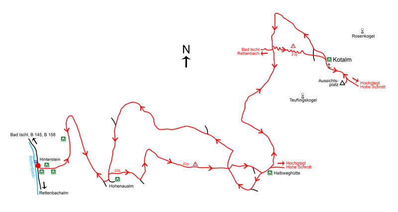 Ausgangspunkt unserer Tour sind die Autoabstellplätze in Hinterstein (ca. 505 m), einem kleinen Ortsteil am Ostrand von Bad Ischl im Rettenbachtal. Schon von hier hat man einen schönen Blick (Abb. 3) auf die oberhalb einer Wiese gelegenen Waldhänge, über die wir zu Beginn der Tour aufsteigen werden. Wenige Meter von den Parkplätzen entfernt zweigt von der Straße, die taleinwärts zur Rettenbachalm führt, links Richtung Nordosten eine markierte, asphaltierte Straße ab. Vorbei an schmucken Wohnhäusern und mit Blick Richtung Nordwesten (Abb. 4) zum nördlich von Bad Ischl gelegenen Leonsberg (1.745 m) geht es hinauf ins Waldgebiet. Bald schon in eine Sandstraße übergehend, führt unser Weg mit Blick Richtung Südwesten zur Katrin (1.542 m, Abb. 5), den Hausberg der Kurstadt, in zwei langgezogenen Serpentinen etwas steiler werdend aufwärts. Gleich nach der zweiten Serpentine biegt nach etwa 30–35 Minuten vom Ausgangspunkt rechts ein markierter Forstweg ab, auf dem wir knapp oberhalb der Hohenaualm (713 m) vorbeiwandern. Etwa 10 Minuten von der letzten Abzweigung biegen wir links in einen markierten Weg ein, der uns mäßig steil aufwärtsführt. Nach einer Rechtskurve im Bereich einer Lichtung geht dann unser Waldweg in einen Steig über. Immer steiler marschieren wir am rechten Rand eines Bachgrabens, der oft wasserlos ist, aufwärts. Nach Querung der Forststraße (ca. 1.020 m), die wir bei der Hohenaualm verlassen haben, nach einem weiteren steilen Waldstück und der Querung einer Lichtung erreichen wir nach ungefähr 1½–1¾ Stunden vom Ausgangspunkt kurz vor der Halbweghütte (1.117 m, Abb. 6) wieder die Forststraße, in die wir links einbiegen und die wir jetzt für längere Zeit nicht verlassen werden.