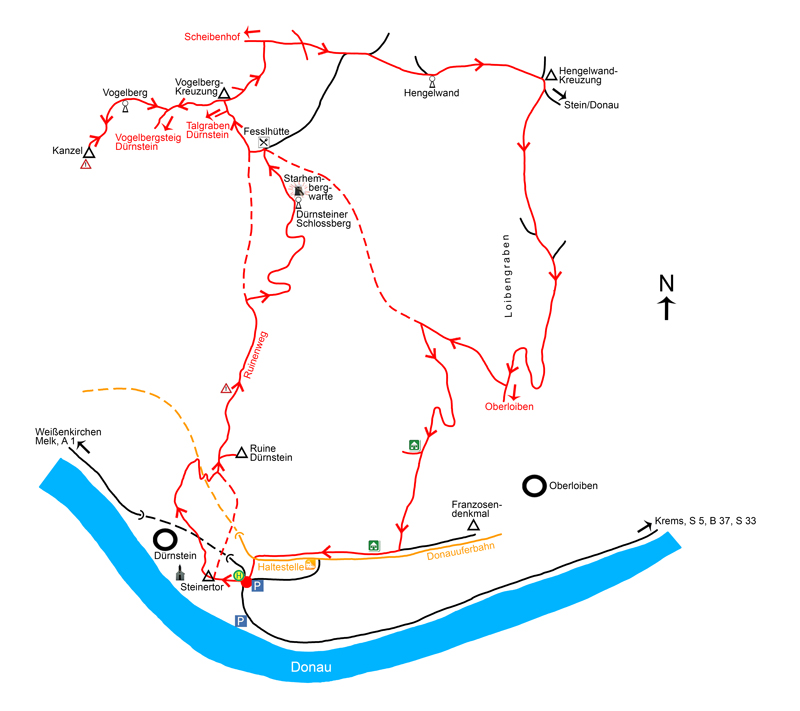 Wir halten uns bei der Forstweg-Kreuzung rechts, biegen aber nach wenigen Schritten gleich wieder rechts vom Forstweg, der nach Stein an der Donau führt, ab. Recht gemütlich geht es nun – immer der blauen Markierung folgend – auf einem breiten Weg, der nach einiger Zeit in einen Forstweg und gleich danach in eine Forststraße mündet, oberhalb des Loibengrabens Richtung Süden abwärts. Nur an wenigen Stellen kann man Richtung Westen einen Blick zu den steilen, bewaldeten Hängen des Dürnsteiner Schlossberges (Abb. 17) genießen. Nach zwei Serpentinen am Talgrund des Loibengrabens angekommen, biegen wir nach rund 30 Minuten von der Hengelwand-Kreuzung rechts auf einen rot markierten Weg ab. Mit einer Gegensteigung von etwa 50 Hm wandern wir auf dem direkten Abstiegsweg von der Fesslhütte auf breitem Weg Richtung Nordwesten ein wenig steiler wieder aufwärts. Nach ca. 5 Minuten biegen wir links in einen gelb markierten Waldsteig ein, auf dem wir nach weiteren 10 Minuten bei den ersten Weingärten (Abb. 18) offenes Gelände erreichen. Stets der gelben Markierung – teilweise wieder auf dem Welterbesteig – folgend, erreichen wir nach zwei Serpentinen und der Durchwanderung eines schwach ausgeprägten Wiesengrabens (Abb. 19) unterhalb der steilen Weinberge auf einer asphaltierten Güterstraße westlich von Oberloiben wieder das Siedlungsgebiet von Dürnstein. Richtung Osten sieht man bei der Einmündung auch das turmförmige Franzosendenkmal (Abb. 20), das an den Krieg gegen das Heer des Franzosenkönigs Napoleon Bonaparte erinnert. Wir zweigen rechts auf eine querende Ortsstraße ein und wandern Richtung Westen parallel zur Bahntrasse der Donauuferbahn – rechts vor uns ist nochmals die Ruine Dürnstein (Abb. 21) sichtbar – vorbei an der örtlichen Bahnhaltestelle. Wenige Meter, bevor die Bahn in einen Tunnel verschwindet, queren wir links die Gleise und gelangen nach etwa 1¾–2,0 Stunden von der Kanzel knapp unterhalb des Vogelbergs wieder zurück zum Ausgangspunkt.