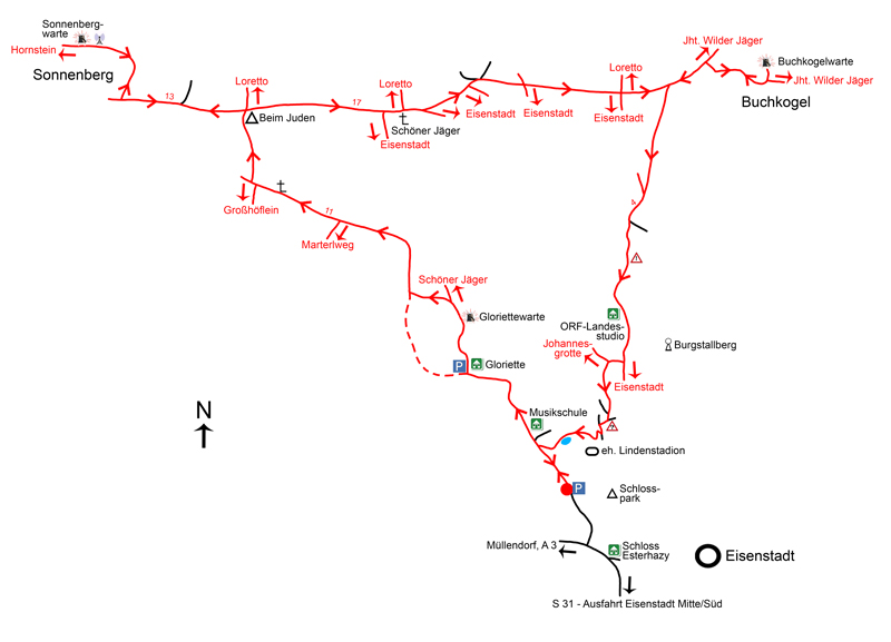 Von den Autoabstellplätzen am Westrand des Eisenstädter Schlossparks mit zahlreichen kleineren und größeren Gegensteigungen fast 550 Hm über die Gloriette-Warte auf den Sonnenberg ungefähr 1¼–1½ Stunden (Aufstieg), von dort in ca. 1¼–1½ Stunden auf den Buchkogel und dann vorbei am ORF-Landesstudio Burgenland in weiteren etwa 1¼–1½ Stunden zurück zum Ausgangspunkt.