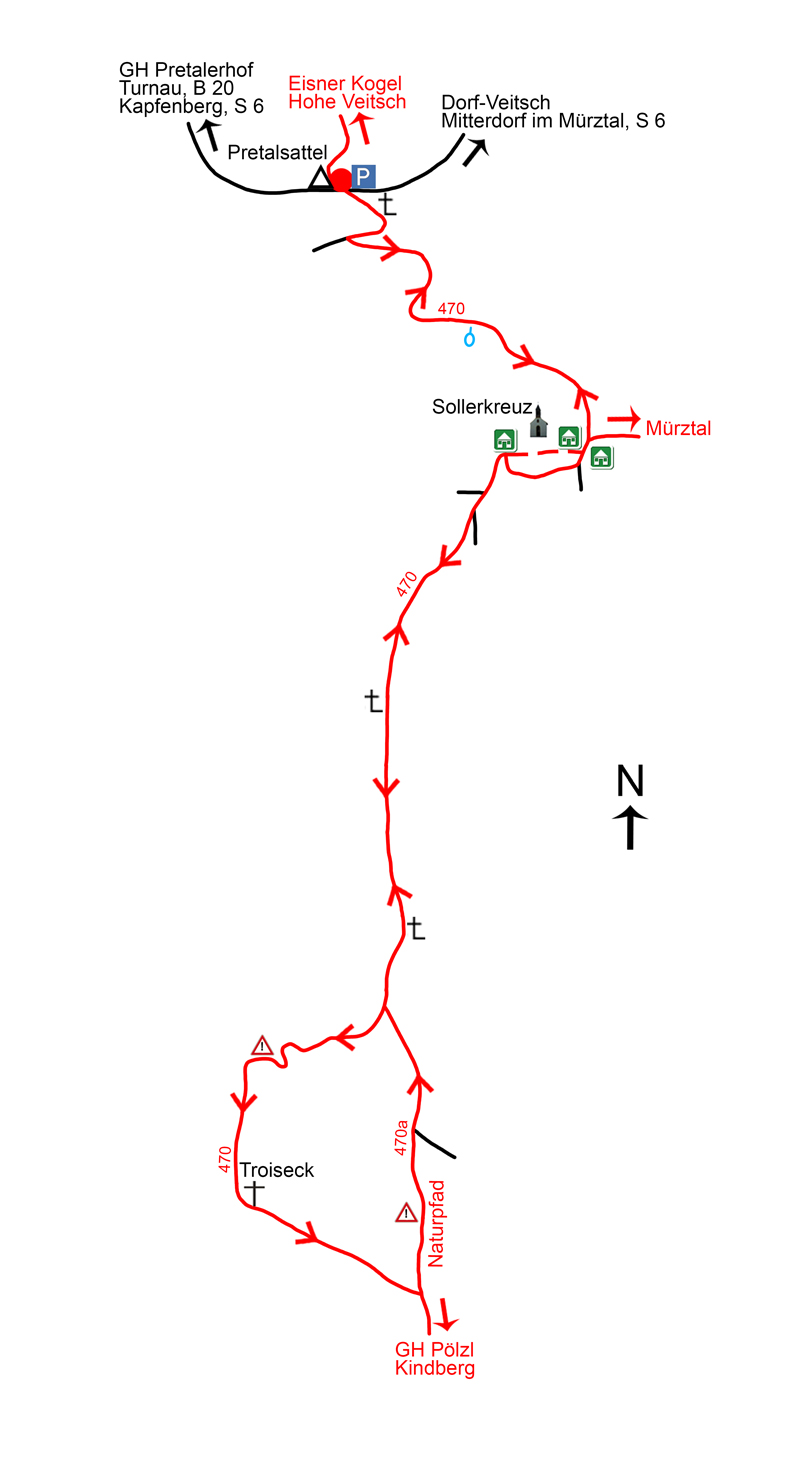 Vom Pretalsattel geht es nicht allzu steil auf einer zu Beginn asphaltierten, markierten Forststraße vorbei an einem Marterl Richtung Süden (Abb. 2) aufwärts. Nach zwei Serpentinen und einem Schranken wird es in weiterer Folge im Bereich einer Quelle für einige Zeit flacher, bevor es nochmals ansteigend zu einer markierten Abzweigung, bei der wir uns geradeaus halten, am unteren Ende einer Alm (Abb. 3) geht. Für dieses erste Teilstück haben wir etwa 15–20 Minuten benötigt. Dort fällt sofort rechts neben der Forststraße eine am Waldrand stehende Kapelle auf (1.148 m) – auf Plänen als Sollerkreuz bezeichnet –, an der es entweder direkt vorbei über den steilen Wiesenhang oder über eine rechts abzweigende, asphaltierte Zufahrtsstraße mit Rechtskurve zu einem Wohnhaus am oberen Ende der Alm geht.