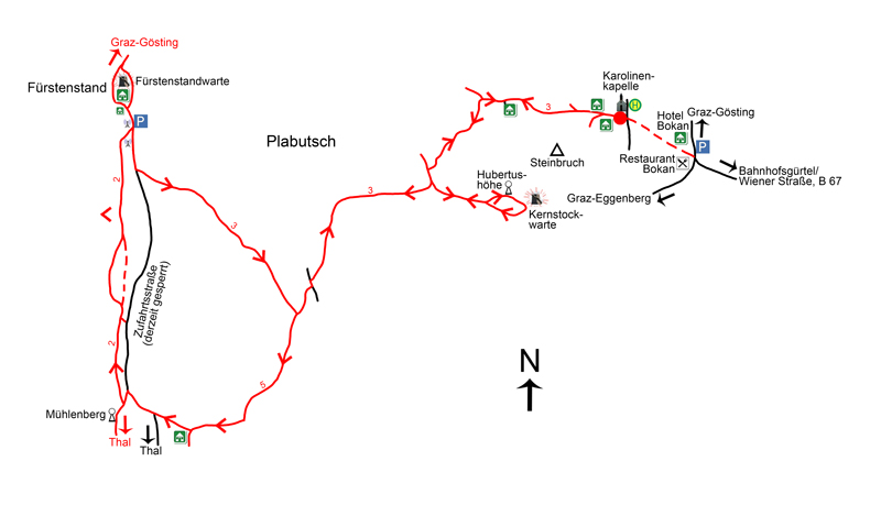 Ausgangspunkt unserer kurzen Wanderung ist am Fuße des Plabutsch (Abb. 2) am Nordrand des Grazer Stadtbezirks Eggenberg die Katholikentagskapelle (379 m, Abb. 3), die auch als Karolinenkapelle bezeichnet wird und die an den Katholikentag 1983 erinnert. Auf dem markierten Karolinenweg (Weg Nr. 3) geht es auf einer asphaltierten Straße Richtung Westen – vorbei an Häusern – aufwärts. Nach einer Straßen-Gabelung, bei der wir geradeaus weitermarschieren, betreten wir Waldgebiet. Beim Übergang in eine Sandstraße wird der Karolinenweg (Abb. 4) immer steiler. 10–15 Minuten später stehen wir bei der nächsten Weggabelung. Links geht es zu einem Gehöft und geradeaus zu einem geschlossenen Schranken, an dem wir vorbeigehen, um mit wenigen Schritten zu einer größeren Wegkreuzung zu gelangen. Hier halten wir uns nun links und wandern erneut steil ansteigend auf einem breiten Steig durch schönes Waldgelände Richtung Südwesten. Nach Einmündung in einen querenden Weg, in den wir links einbiegen, erreichen wir nach etwa 25–30 Minuten vom Ausgangspunkt die Abzweigung zur Kernstockwarte, die wir aber erst später beim Abstieg besuchen werden.