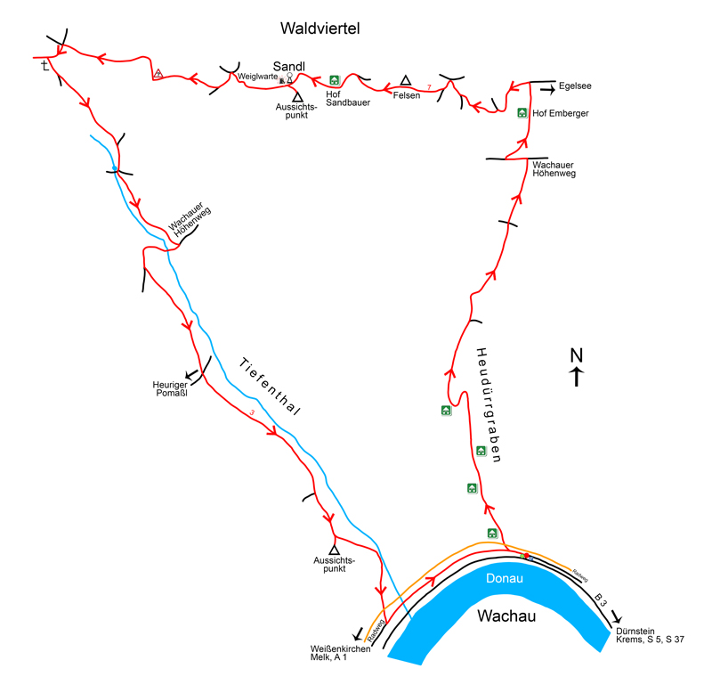 Was für ein Kontrast: Auf der einen Seite die von Touristen und Ausflüglern gestürmte Welterbe-Region Wachau und auf der anderen Seite das angrenzende Waldviertel, in dem man oft einsam die Natur genießen kann. Beim nachfolgenden Wandertipp, der beim nördlichsten Punkt der von der Donau durchflossenen Flusslandschaft startet, geht es durch den Heudürrgraben zuerst auf das Hochplateau des Waldviertels und von diesem weiter auf den 723 m hohen Sandl (Abb. 1), auf dessen höchster Stelle die im Jahr 1902 errichtete Weiglwarte steht. Absteigen werden wir danach durch das Tiefental.