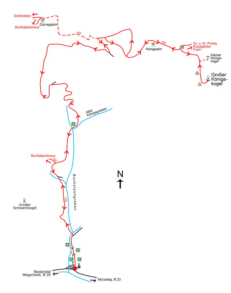 Wie Zwillinge ragen die beiden Grashügel (Abb. 1) – von Westen aus betrachtet links der Kleine Königskogel (1.552 m) mit seinem schon von Weitem sichtbaren Gipfelkreuz und der südlich benachbarte, um 22 Meter höhere Große Königskogel nur mit einem Minikreuz – oberhalb der Königsalm empor. Der nachfolgende Wandertipp führt vom kleinen Weiler Dobrein westlich von Mürzsteg durch den engen, von felsdurchsetzten, steilen Waldhängen flankierten Buchalpengraben zur Königsalm und von dieser weiter auf den Großen Königskogel. Von seinem Gipfel hat man einen grandiosen Rundblick. Dazu ein wichtiger Hinweis: Bergwanderer, die lange Wegstrecken auf Forststraßen nicht mögen, sollten diese Wanderung lieber nicht unternehmen, denn erst im Gipfelbereich wird es wegetechnisch spannend!