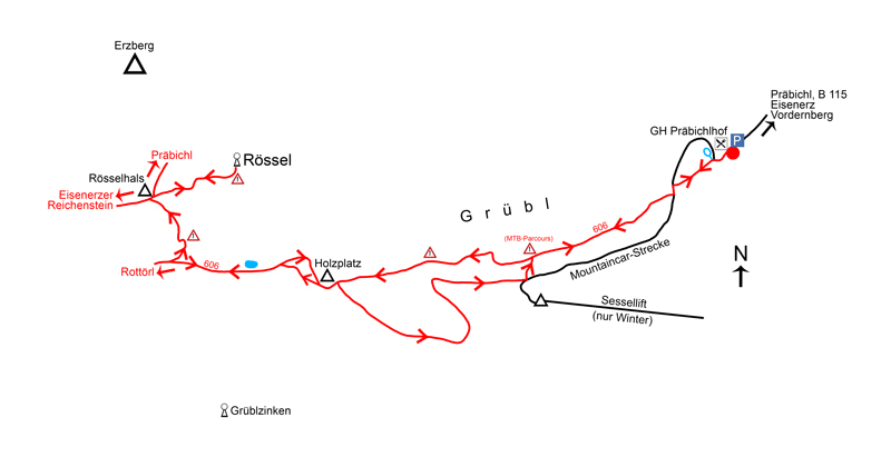 Technisch unschwierige, kurze, teilweise steile und steinige bzw. leicht felsige Tour auf bis zum Rösselhals stark begangenen Karrenwegen, Steigen und Wiesenpfaden. Der steile, oft rutschige Aufstiegsweg im Grübl kann auf dem parallel verlaufenden Karrenweg, den wir beim Abstieg verwenden, umgangen werden. Vorsicht beim Auf- bzw. Abstieg über steiles Wiesengelände und im schmalen Gipfelbereich des Rössels, hier ist vor allem bei nassen Bodenverhältnissen Trittsicherheit ratsam! Der alternative Abstiegsweg vom Rösselhals nördlich vorbei am Rössel ist laut Auskunft von Einheimischen an vielen Stellen ungepflegt. Es gibt wochentags unangekündigte Sprengungen auf dem Erzberg!
