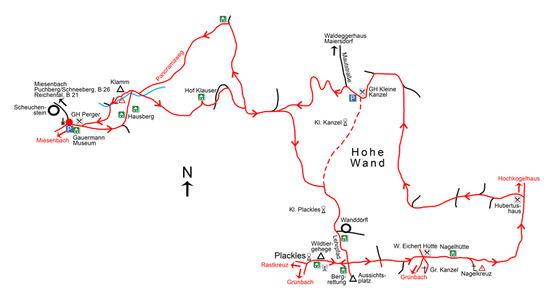 Wir starten unsere Wanderung direkt neben dem Museum (ca. 550 m, Abb. 3) und wandern auf einer asphaltierten Ortsstraße Richtung Osten (Abb. 4) den Waldhängen der Hohen Wand entgegen. Nach ein paar Schritten kommen wir zu einer Wanderwegkreuzung, bei der wir aber beim Aufstieg geradeaus auf der Ortsstraße bleiben. Auf dem hier links abzweigenden Panoramaweg werden wir dann unsere Wanderung beenden. Vorbei an Wohnhäusern geht es zum Ortsende und dann – steiler werdend – mit einem Linksbogen hinauf zum Weiler Hausberg, von dem man einen schönen Blick Richtung Westen (Abb. 5) nach Scheuchenstein und zum Miesenbachtal genießt. Im Waldgelände geht es leicht abwärts, dann treffen nach 10–15 Minuten vom Ausgangspunkt der Panoramaweg und unsere Aufstiegsvariante wieder aufeinander. Wir halten uns rechts. Kurz vereint, trennen sich nach ein paar Metern bei einer Lichtung der links abzweigende Panoramaweg, den wir beim Abstieg verwenden werden, und die asphaltierte Bergstraße, auf der wir geradeaus mäßig steil ansteigend weiterwandern. Nach Passieren eines Felsdurchbruchs (Abb. 6) kommen wir auf einen großflächigen Wiesenbereich (Abb. 7), über den wir mit einem Linksbogen zum Hof Klauser (ca. 700 m) marschieren, den wir nach etwa 25–30 Minuten vom Ausgangspunkt erreichen.