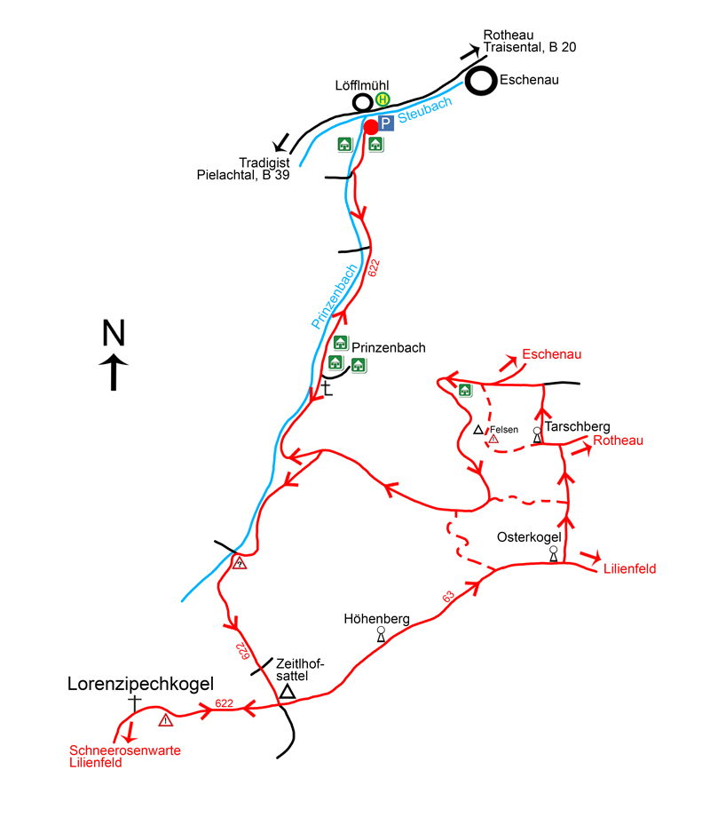 Wir setzen unsere Wanderung auf der geradeaus führenden, nicht markierten Forststraße fort und genießen bei einer links stehenden Hütte einen Blick Richtung Süden (Abb. 20) zum Lorenzipechkogel und zum Höhenkogel. Mit einigen weit ausholenden Serpentinen geht es nun – bald schon unterhalb der Felsen auf den Westhängen des Tarschbergs – in den Kohlgraben. In seinem oberen Bereich münden bei einer links von uns liegenden Wiese bzw. wenige Schritte später bei einem von links kommenden Forstweg die beiden Abstiegsvarianten, mit denen man unsere Wanderung hätte verkürzen können, in unsere Forststraße. Nach etwa 40–45 Minuten vom Tarschberg gelangen wir dann zu jener Forststraßen-Gabelung im unteren Bereich des Kohlgrabens, bei der wir wieder auf unseren Aufstiegsweg treffen. Entlang des Prinzenbachs geht es nun Richtung Norden (Abb. 21) in etwa 20 Minuten durch den Weiler Prinzenbach zurück zum Ausgangspunkt, den wir vom Lorenzipechkogel mit Überschreitung der drei weiteren Erhebungen nach ungefähr 2¼–2½ Stunden erreichen.