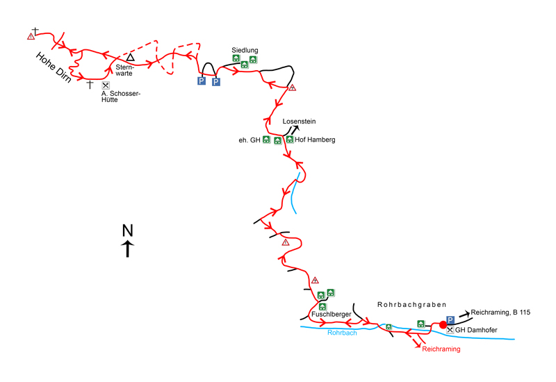 Vom GH Damhofer (ca. 435 m, Abb. 2) wandern wir auf einer asphaltierten Straße vorbei an einigen Gebäuden und – einige Male den Bach querend – im Rohrbachgraben Richtung Westen (Abb. 3) stetig aufwärts. Bald schon mündet von links der von Reichraming kommende, markierte Wanderweg in die Talstraße. Nach rund 10–15 Minuten halten wir uns bei einer Straßen-Gabelung (514 m) links, queren den Bach und nähern uns bei einer abzweigenden Forststraße dem Talschluss. Mit einer Rechtskurve verlassen wir den Rohrbachgraben und gehen mit wenigen Schritten zu einigen Gebäuden (ca. 570 m) – unter anderem dem Hof Fuschlberger –, bei denen nach ungefähr 20–25 Minuten vom Ausgangspunkt die asphaltierte Straße endet und wir links Richtung Norden auf einen steilen Wiesenpfad abbiegen.