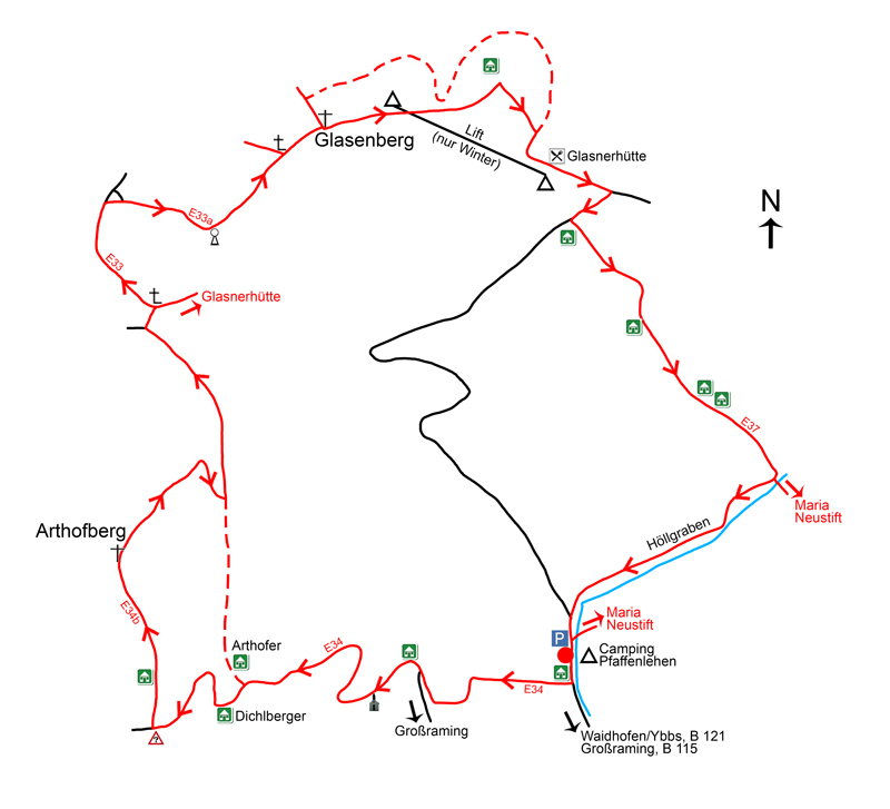 Vorbei an der Talstation des Skilifts und an einem Parkplatz, kommen wir auf einer asphaltierten Straße nahe eines Bauernhofs zu einer Straßengabelung, bei der wir rechts Richtung Westen abbiegen. Kurz sind wir noch auf einer asphaltierten Straße, nun biegen wir beim nächsten Bauernhof links auf einen breiten Weg ab. Auf diesem geht es – immer wieder mit tollen Blicken Richtung Süden (Abb. 22) zum Wallfahrtsort – etwas steiler abwärts zu einem Haus. Mit einem nicht allzu langen, ein wenig steileren Wegstück auf einem Steig durch Waldgelände gelangen wir bei einem Bauernhof erneut auf eine asphaltierte Straße. Vorbei an einem mondänen Wohnhaus geht es teilweise im Waldgelände zu einer Abzweigung (ca. 520 m), bei der man links hinauf nach Maria Neustift (Abb. 23) wandern kann. Wir bleiben auf der asphaltierten Straße, die sich mit einer Rechtskurve Richtung Westen wendet und mäßig steil absteigend durch den Höllgraben entlang unseres zweiten Gipfelziels (Abb. 24) zurück zu unserem Ausgangspunkt beim Campingplatz Pfaffenlehen (Abb. 25) führt, den wir vom Gipfel des Glasenbergs nach 1,0–1¼ Stunden erreichen.