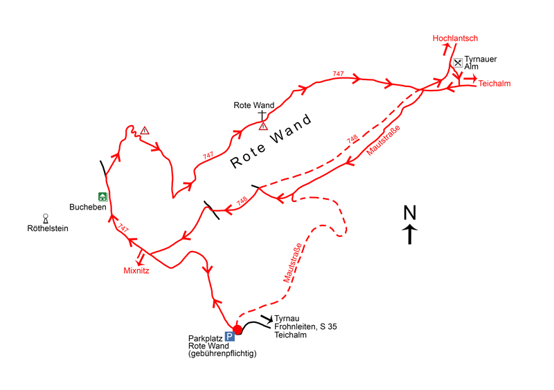 Ausgangspunkt unserer Wanderung ist der hoch über dem kleinen Ort Tyrnau gelegene, kostenpflichtige Parkplatz Rote Wand (875 m, Abb. 2), für dessen Benützung man eine Kreditkarte bzw. Debitkarte mit NFC-Funktion benötigt – Barzahlung ist nicht möglich. Wer sich einiges an Hm sparen will oder den Rundweg gar nicht in voller Länge benützen und nur zum Gipfel der Roten Wand auf demselben Weg auf- und absteigen möchte, kann vom Parkplatz auf einer Mautstraße bis zur Tyrnauer Alm fahren, wo beim Hüttenwirt die Maut zu bezahlen ist. Wir aber wandern auf einer oberhalb des Parkplatzes beginnenden Forststraße Richtung Westen (Abb. 3) der mächtigen, rot schimmernden Felswand entgegen. Nach einer etwas steileren Wegpassage Richtung Süden und danach fast eben erneut Richtung Westen gelangen wir rund 25–30 Minuten später zu jener Weggabelung (ca. 1.020 m), bei der wir nun unsere Wanderung im Uhrzeigersinn auf dem markierten Rundweg fortsetzen.