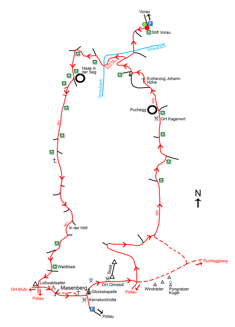 Wir starten unsere Wanderung beim Haupteingang des Stiftes (691 m, Abb. 2), bei dem es einige größere Parkplätze und eine Linienbushaltestelle gibt. Zu Beginn wandern wir rechts entlang einer Begrenzungsmauer des Stiftsareals leicht abwärts Richtung Westen. Im offenen Gelände wird unser breiter Weg steiler und wir erreichen mit einem Linksbogen nach rund 5–10 Minuten bei einer Brücke über den Voraubach (620 m) die niedrigste Stelle unserer Wanderung. Im Waldgelände geht es nun Richtung Südwesten wenige Minuten steiler bergan, bis wir rechts in den nach dem „Steirischen Prinzen“ benannten Erzherzog Johann Weg einbiegen. Es geht in einem langgezogenen Bogen zuerst nochmals abwärts, danach wieder kurz aufwärts und zuletzt erneut abwärts zu einer weiteren Querung des Voraubachs über eine schmale Holzbrücke. Wir passieren auf einer asphaltierten Zufahrtsstraße einen kleinen Weiler und verlassen diese links für einen kurz etwas steiler ansteigenden Waldsteig, der uns zu einer Wiese führt, die von uns geradeaus aufsteigend gequert wird. Es geht ein weiteres Mal vorbei an einem Hof, bis wir auf eine asphaltierte Landstraße gelangen, in die wir links einbiegen. Nach 5 Minuten nahezu ohne Ansteigung biegen wir – ungefähr 25–30 Minuten vom Ausgangspunkt – im Weiler Haas in der Sag rechts auf eine weitere asphaltierte Landstraße ab.