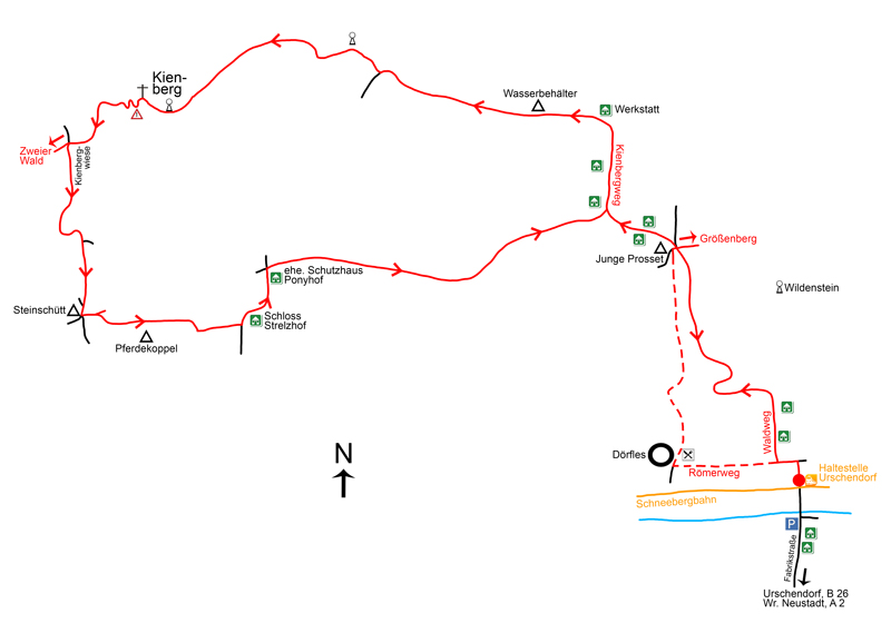 Ausgangspunkt unserer eher kurzen Wanderung ist die an der Schneebergbahn, der Zugverbindung von Wr. Neustadt nach Puchberg am Schneeberg, gelegene Bahnhaltestelle Urschendorf (347 m, Abb. 3). Mit wenigen Schritten wandert man auf der Fabrikstraße Richtung Westen hinauf zum querenden, ebenfalls asphaltierten Römerweg, in den man am Ortsbeginn von Dörfles links einbiegt. Keine 20 m später verlässt man den Römerweg wieder und biegt rechts in den Waldweg ein. Auf diesem – auch dieser ist asphaltiert – marschiert man etwas steiler aufwärts zum Waldrand. Beim letzten Haus wendet sich der Weg nach links und geht in einen breiten Sandweg über. Nach einer S-Kurve betritt man das Waldgelände und wandert noch kurz aufwärts. Es geht westlich am Wildenstein (448 m) vorbei dann wieder abwärts, bis man nach rund 15 Minuten vom Ausgangspunkt zur Straßenkreuzung „Junge Prosset“ (387 m, Abb. 4) gelangt, bei der man einen ersten Blick zur Hohen Wand genießt. Dort biegen wir – uns geradeaus haltend – in den asphaltierten Kienbergweg ein.