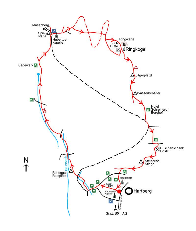 Am südöstlichen Ende des Masenberg-Massivs – mit dem namensgebenden Masenberg (1.261 m) als höchster Erhebung – befindet sich mit dem Ringkogel (789 m, Abb. 1) das Gipfelziel des nachfolgenden Wandertipps. Auf Grund der strategisch günstigen Lage des Hausberges von Hartberg – man überblickt weite Teile der Oststeiermark – haben schon die Kelten eine von einem Wall umgebene Höhensiedlung errichtet. Auch die Römer schätzten die Sonnenhänge des Ringkogels und kultivierten den Weinanbau. Seit über 100 Jahren steht auf dem Gipfel die 30 m hohe Ringwarte, von der man eine grandiose Aussicht genießt.