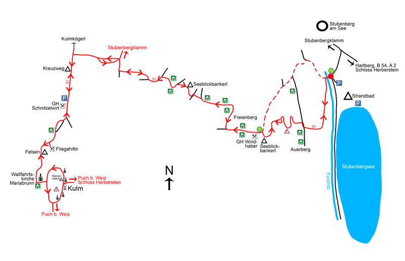 Von der Wallfahrtskirche geht es in ungefähr 10 Minuten Richtung Norden wieder zum Steirischen Schnitzelwirt. Auf dem Straßenweg dorthin und auch in weiterer Folge unseres Rückwegs, der auf dem Aufstiegsweg erfolgt, gibt es immer wieder schöne Ausblicke zum Stubenbergsee (Abb. 22). Weitere 10 Minuten benötigen wir mit leichten Gegensteigungen zum Kulmkögerl. Steil geht es dann im Wald abwärts Richtung Osten zur Wegteilung, wobei man im unteren Teil den rechts parallel, am Wiesenrand entlang führenden Weg verwenden kann, von dem man einen schönen Blick Richtung Südosten (Abb. 23) genießt. Auf dem Aufstiegsweg wandern wir weiter zu den unterschiedlich hoch gelegenen Ortsteilen von Freienberg. Dabei sieht man Richtung Nordosten (Abb. 24) das Ortszentrum von Stubenberg. Nach einer guten Stunde passieren wir im untersten Teil von Freienberg das GH Windhaber. Beim dortigen „Seeblickbankerl“, bei dem man ein letztes Mal den Stubenbergsee (Abb. 25) überblickt, muss man sich dann entscheiden, ob man auf dem sehr steilen, großenteils umgeleiteten Aufstiegsweg in 15–20 Minuten oder eine Spur länger über die links führende, asphaltierte Straße zum Ausgangspunkt absteigt. Für den gesamten Abstieg benötigt man ungefähr 1¼–1½ Stunden.