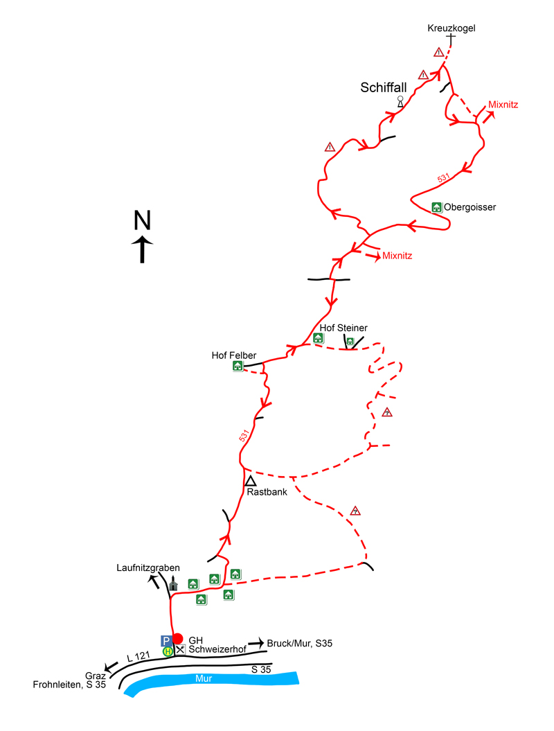 Mitten in den teilweise recht felsigen Grazer Hausbergen windet sich zwischen Bruck an der Mur und der steirischen Landeshauptstadt das Murtal von Norden nach Süden. Nur zwischen dem kleinen Ort Röthelstein und Rothleiten, einem nördlichen Stadtteil von Frohnleiten, ändert sich die Flussrichtung der Mur für ein paar Kilometer von Osten nach Westen. Genau in diesem Bereich befindet sich das Gipfelziel unseres nachfolgenden Wandertipps. Der 1.221 m hohe Schiffall (Abb. 1) – dieser wird gerne auch mit drei „f“ geschrieben – ist durch einen felsdurchsetzten Waldgrat mit dem Kreuzkogel (1.181 m), zu dessen Gipfelkreuz wir aber über einen mit Seil gesicherten Felssteig nicht aufsteigen werden, verbunden. Die an einigen Stellen steil abwärts führende Begehung des Gipfelgrats erfordert auf jeden Fall Trittsicherheit und stellt mit Sicherheit die größte Herausforderung auf dieser Tour dar! Aber auch sonst überrascht der Schiffall immer wieder mit steilen Wegpassagen.
