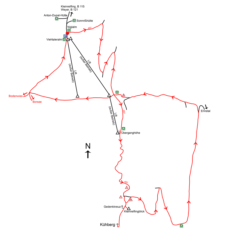 Der Ausgangspunkt unserer Wanderung liegt am Ende der etwa 7,3 km langen, asphaltierten Bergstraße, die von der Bundesstraße B 115 Richtung Kleinreifling abzweigt und nach Querung der Ennsbrücke und der Ortsdurchfahrt durch den teilweise klammartigen Hammergraben zum leider geschlossenen Berggasthof Niglalm (823 m) führt. Als „Überbleibsel“ des ehemaligen Skigebietes Sonnriß stehen heute noch auf dem Parkplatz zwischen der Niglalm und der ebenfalls geschlossenen Viehtaleralm genügend Autoabstellplätze zur Verfügung. Übrigens gibt es wenige Meter, bevor man zur Niglalm kommt, mit der Anton-Dupal-Hütte und der Sonnrißhütte, die beide von den Österreichischen Naturfreunden betrieben werden, zwei Selbstversorgerhütten, die man mieten kann.
