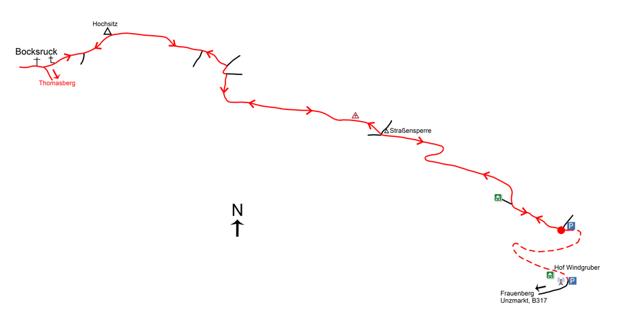 Von der Abzweigung von der Forststraße ein Stück oberhalb des Hofs Windgruber auf den Bocksruck etwas über 500 Hm in ungefähr 1½–1¾ Stunden (Aufstieg) bzw. über den Aufstiegsweg in ca. 1¼–1½ Stunden (Abstieg). Hat man das Auto bereits beim Hof Windgruber geparkt, hat man einen zusätzlichen Auf- und Abstieg von insgesamt ca. 15 Minuten (+ 50 Hm).