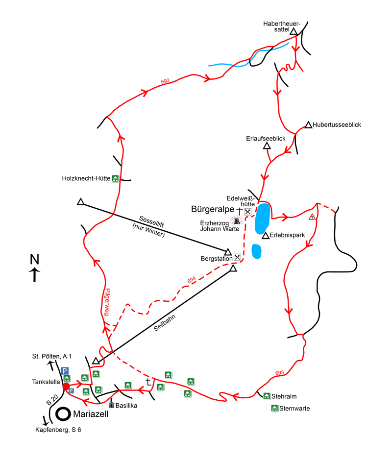 Ausgangspunkt unserer Rundtour ist die Kreuzung (ca. 845 m), bei der man bei Km 76,6 von der Bundesstraße B 20, die als Umfahrungsstraße westlich am Wallfahrtsort vorbeiführt, ins Ortszentrum von Mariazell abbiegen kann. Dort stehen mehrere größere, gebührenpflichtige Parkplätze zur Verfügung. Wir empfehlen den links von einer Tankstelle liegenden Parkplatz, da bei diesem die Tagesgebühr um einiges günstiger ist. Bereits vom Ausgangspunkt genießt man einen schönen Blick Richtung Westen (Abb. 3) ins Mariazeller Bergland. Wir wandern auf einer Ortsstraße gleich rechts von der Tankstelle Richtung Osten hinauf zur Wiener Straße, in die wir links einbiegen. Nach wenigen Schritten zweigt rechts die schmale Viktor-Lang-Gasse ab, auf der wir kurz steil aufsteigen. Dann verlassen wir diese und gehen links oberhalb der Talstation der Bürgeralpe-Seilbahn zu einem breiten Sandweg, auf dem es steil aufwärts geht. Hier lohnt es, sich umzudrehen und den tollen Blick zur Basilika Mariazell (Abb. 4) zu genießen. Bei der ersten Gelegenheit halten wir uns wieder rechts und gelangen nach ungefähr 10 Minuten vom Ausgangspunkt zum querenden, markierten Pielachtaler Pilgerweg, in den wir links einbiegen.