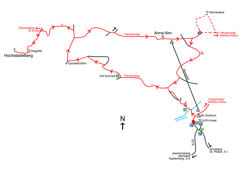 Ausgangspunkt unserer Tour ist die Abzweigung bei Km 54,0 von der Bundesstraße B 20 (ca. 910 m) zu den Parkplätzen des Skigebietes Annaberg. Wir gehen unterhalb des JUFA-Hotels (Abb. 2) vorbei am gebührenpflichtigen Parkplatz P 2 und einigen Autoabstellplätzen, die außerhalb der Skisaison gratis benützt werden können. Auf einer asphaltierten, markierten Zufahrtsstraße geht es dann Richtung Norden abwärts ins Skizentrum Annaberg mit einigen Liftanlagen und – wir halten uns links – in einen Graben, der vom kleinen Tannbach durchflossen wird. Bei der Brücke über den Bach (ca. 880 m) neben einem Wohnhaus (Abb. 3) haben wir den tiefsten Punkt unserer Wanderung erreicht. Nun geht es erstmals aufwärts und wir erreichen nach ungefähr 5–10 Minuten vom Ausgangspunkt offenes Gelände (492 m). Von einer links neben dem Weg etwas erhöht stehenden Rastbank hat man Richtung Norden (Abb. 4) einen schönen Blick hinauf zur Bergstation eines Sessellifts, zur daneben stehenden Anna Alm und den vielen Skipisten, die vom Hennesteck talwärts führen. Dabei sieht man, dass am Ende unserer Tour ein recht steiler Abstieg auf uns wartet.