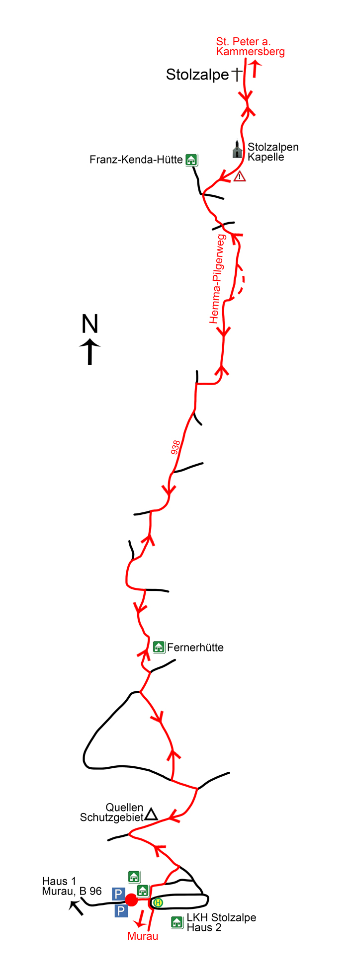 Den Namen „Stolzalpe“ verbinden viele Menschen mit dem hoch über Murau gelegenen, aus zwei Bettenhäusern bestehenden Landeskrankenhaus. Dabei vergisst man, dass dieses recht aussichtsreich auf den Südhängen des namensgleichen Gipfels (1.817 m, Abb. 1) steht, den wir beim nachfolgenden Wandertipp besteigen werden. Dabei wandern wir auf einer der 8 Pilgerrouten, die der Hl. Hemma geweiht sind und die alle – aus verschiedenen Himmelsrichtungen kommend – nach Gurk führen, wo die für ihre Wohltätigkeit bekannte und beliebte Heilige begraben ist. Der von uns verwendete Hemma-Pilgerweg startet in Admont, wo sich ein berühmtes Benediktinerstift befindet, führt von St. Peter am Kammersberg über die Stolzalpe nach Murau und erreicht hinter einem weiteren Klosterort südöstlich von Murau, St. Lambrecht, bei der Grebenzen (1.892 m) die Landesgrenze zwischen der Steiermark und Kärnten.