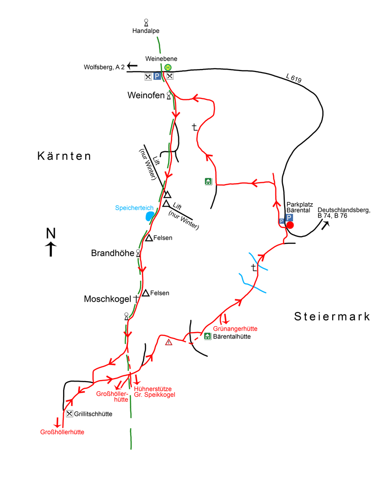 Ausgangspunkt unserer nicht allzu langen, bis auf eine Stelle beim Abstieg gemütlichen Rundtour ist der Parkplatz Bärental (ca. 1.560 m, Abb. 2) bei Km 20,6 auf der Landstraße L 619 wenige Kilometer vor der Passhöhe. Gegenüber vom großen Parkplatz gibt es noch ein paar wenige weitere Autoabstellplätze. Hier starten wir mit dem rechts abzweigenden Waldweg, auf dem wir parallel zur Landstraße rund 5 Minuten gemächlich Richtung Norden aufsteigen. Dann wendet sich der Weg nach links und es geht im lichter werdenden Wald steiler ansteigend rund 10 Minuten aufwärts, bis wir bei einem Haus (Abb. 3) auf einen querenden Forstweg stoßen, auf den wir rechts abbiegen. Erneut Richtung Norden wandern wir – mit Blick zum mit Windrädern bestückten Glashüttenkogel (1.762 m, Abb. 4) und Richtung Osten (Abb. 5) in das recht flache Gebiet südlich der Landeshauptstadt Graz – nur mäßig ansteigend vorbei an einem Gedenkkreuz (Abb. 6) und ersten Felsformationen bis zu einem Viehgatter. Gleich nach diesem erreichen wir mit einer Linkskurve endgültig offenes Gelände (Abb. 7): Jetzt sind es nur mehr wenige Schritte und wir stehen neben dem ersten Gipfel auf dem die Landesgrenze bildenden Kamm. Der neben zwei Skilift-Bergstationen liegende, eher bescheidene Felsgipfel des Weinofens (Abb. 8), zu dem wir vom Ausgangspunkt nach ungefähr 40–45 Minuten gelangen, befindet sich knapp oberhalb und etwas südlich vom Pass der Weinebene. Ein Stück Richtung Norden (Abb. 9) befindet sich mit der Handalpe (1.853 m) ein weiterer mit Windrädern bestückter Berg.