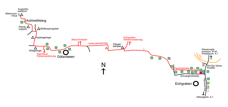 Am besten man geht wieder am Hinweg zurück zum Ausgangspunkt. Also am Beginn mit wenigen Schritten hinauf zum Autobus und dann abwärts zum Militärsperrgebiet. Mit Blick zum nahen Schöpfl (893 m, Abb. 17), dem höchsten Gipfel des Wienerwaldes, geht es abwärts zur Landstraße, in die wir links einbiegen. Es geht Richtung Osten (Abb. 18) erneut auf dem von rechts einmündenden Höhenweg durch Götzwiesen und im offenen Gelände (Abb. 19) vorbei an dem links führenden Weg nach Maria Anzbach zum Wiesenstreifen (Abb. 20), bei dem wir links von der Landstraße abzweigen. Dann wartet die – unter Umständen rutschige – kurze Gegensteigung auf uns. Zurück zur Weggabelung verlassen wir rechts den Höhenweg. Wer Lust hat kann noch ein paar Meter am links ins offene Gelände führenden Höhenweg verbleiben und einen schönen Wienerwaldblick Richtung Nordosten (Abb. 21) genießen. Am breiten, markierten Waldweg Nr. 11 wandern wir dann wieder abwärts zu den ersten Häusern von Eichgraben und auf der Paukhofstraße und der Schweighofstraße zum Ausgangspunkt (Abb. 22), den wir vom Kohlreithberg nach ungefähr 1,0–1¼ Stunden erreichen.