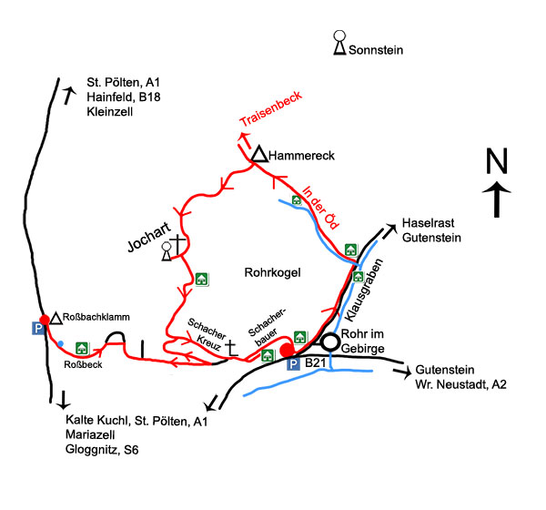 Durch einen schmalen Graben geht es – nun wieder rot markiert – wenige Schritte abwärts zu einer Forststraße und links auf dieser weiter vorbei am Schacherbauern. Von hier sind es noch einige Minuten auf asphaltierter Straße zurück zum Ausgangspunkt beim Ort Rohr im Gebirge, den man nach ca. 1½–1¾ Stunden von der Jochart erreicht.